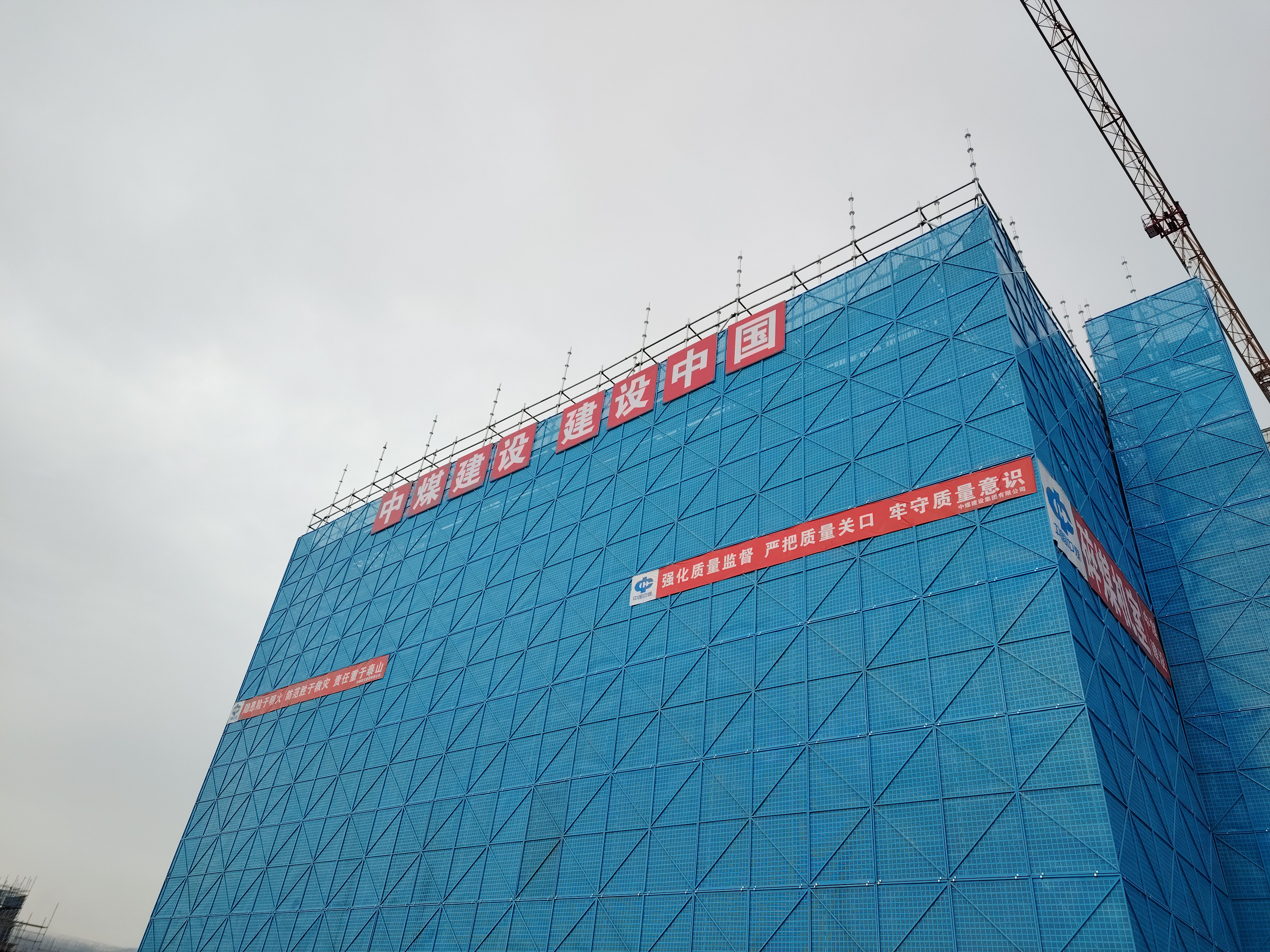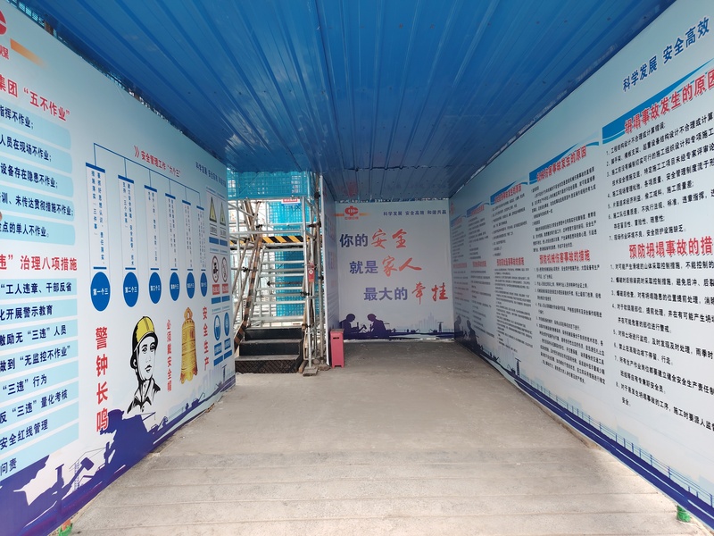 现场安全防护是施工过程中的核心环节,其标准化程度直接关乎作业人员生命安全。项目部严格遵循盘扣式脚手架、临时用电、高处作业等相关行业标准。在盘扣脚手架搭设前,编制并论证专项方案,明确搭设参数、工艺要求与安全控制要点;搭设过程中严格执行“先验收后使用、分层搭设分层验收”制度。脚手架外侧满挂蓝色钢板网,作业层脚手板铺设严密、固定牢固,下方加设安全平网,形成双重防护。外立面设置醒目警示标识与挡脚板,挡脚板粘贴黑黄警示条以增强辨识度。现场防护采用工具式围栏,栏杆涂刷红白相间警示漆。安全通道设计遵循简约实用原则,外侧挂设钢板网,内侧张贴公司安全文化标语。楼梯防护采用定型化防护栏杆,成为全厂标准化示范样板,获多方认可。