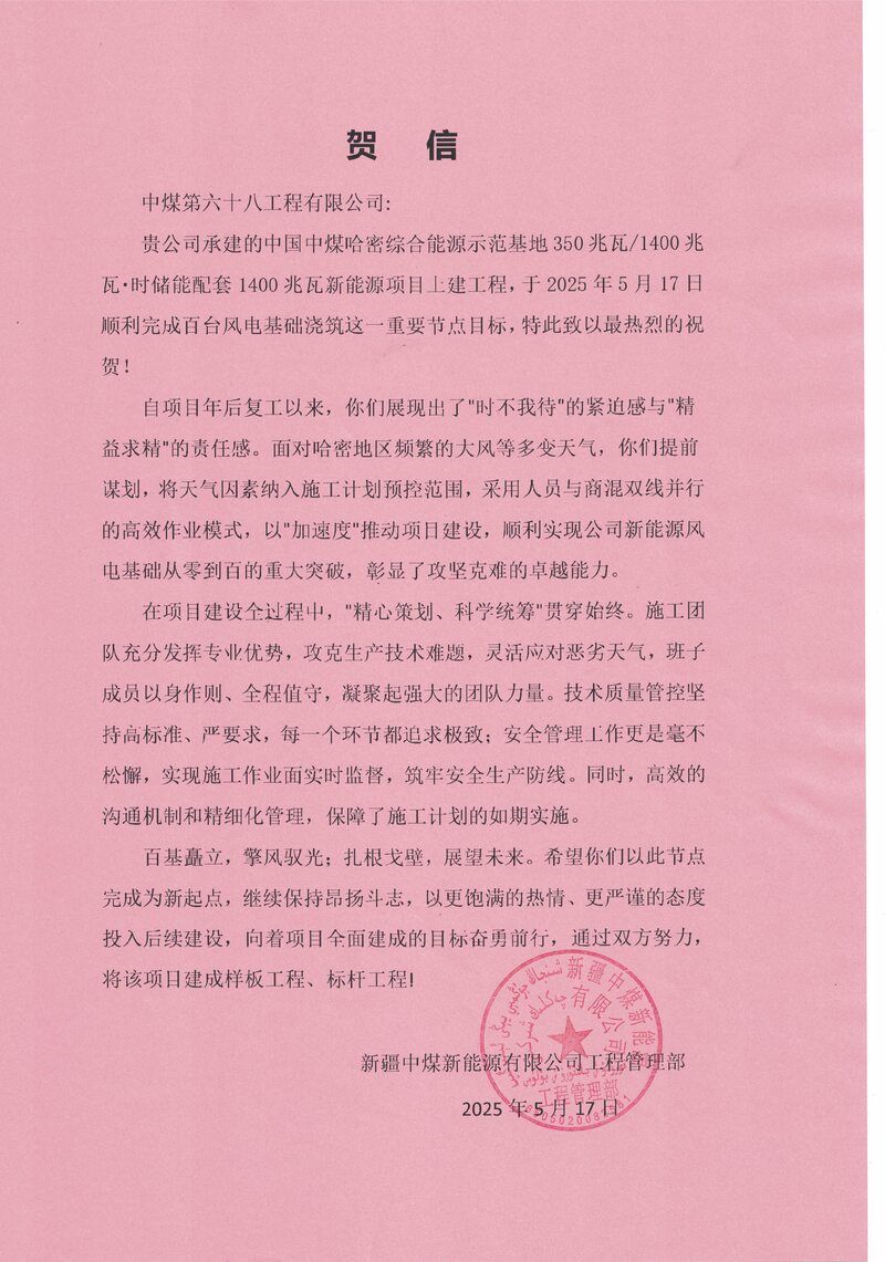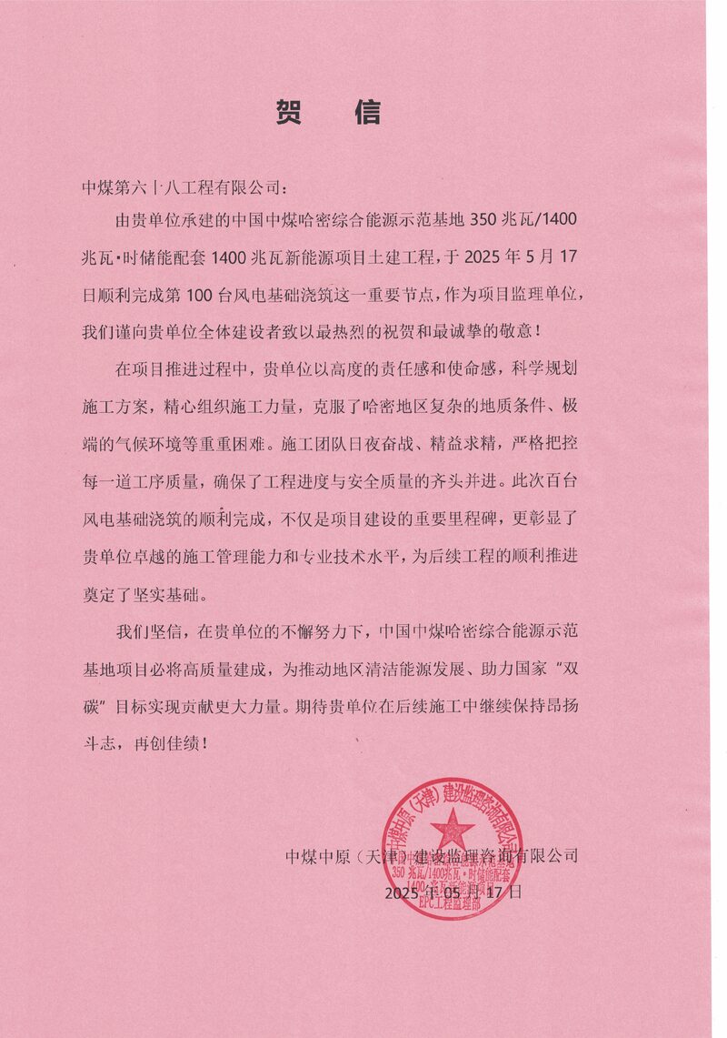 近日,公司接连收到新疆中煤新能源有限公司、中煤中原(天津)建设监理咨询有限公司发来的贺信,祝贺公司承建的中国中煤哈密综合能源示范基地140万千瓦新能源项目顺利完成100台风机基础施工节点。