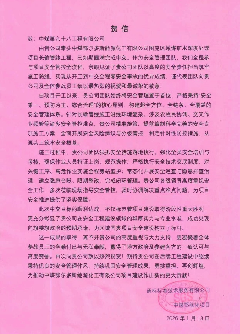 近日,由中煤第六十八工程有限公司牵头承建的中煤鄂尔多斯能源化工有限公司图克区域煤矿水深度处理项目长输管线工程,已如期圆满完成中间交接。通用标准技术服务有限公司特发贺信,向中煤六十八公司及全体参建员工致以热烈祝贺和崇高敬意,赞誉其实现了从开工到中交全程零安全事故的优异成绩。