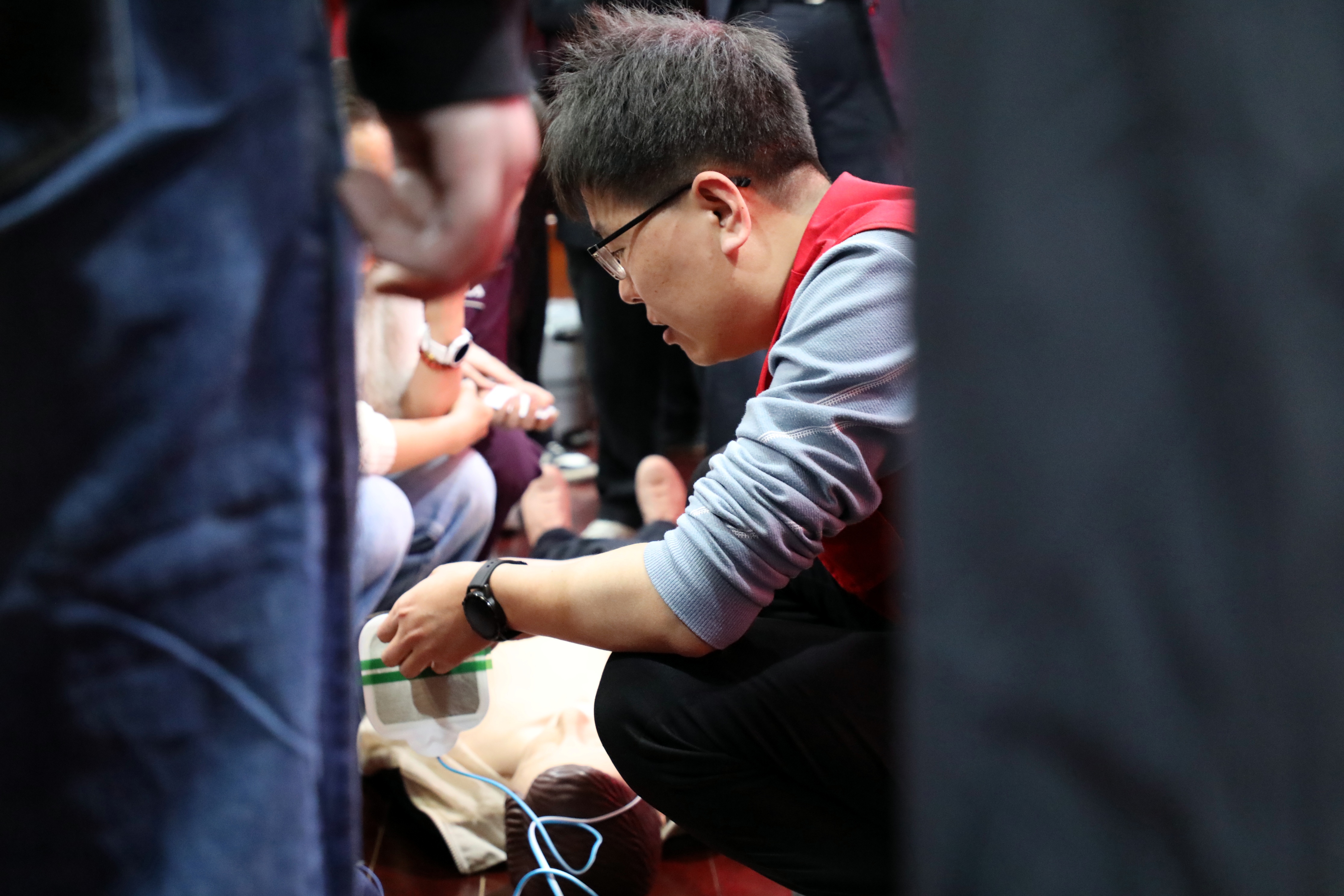 在实操环节,参训人员在讲师的指导下,分组进行了模拟演练。大家利用人体模型反复练习胸外按压、开放气道、人工呼吸等动作,认真感受按压的深度与频率,并学习了心肺复苏、AED 设备的开机、电极片粘贴、心律分析及除颤操作。讲师逐一纠正学员的动作细节,确保每个人都能熟练掌握规范的操作流程。