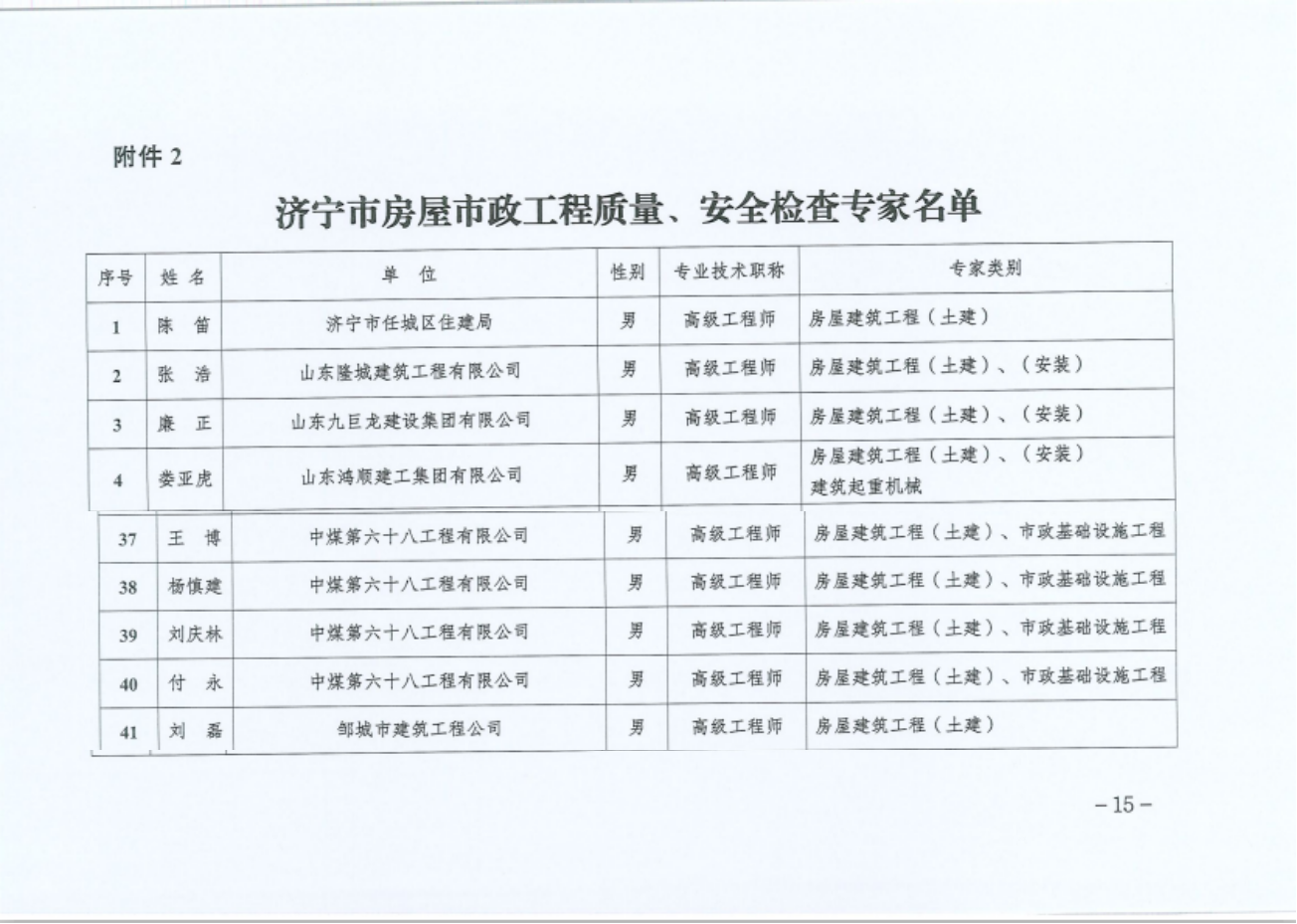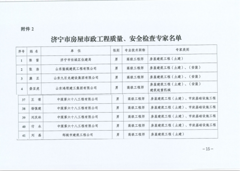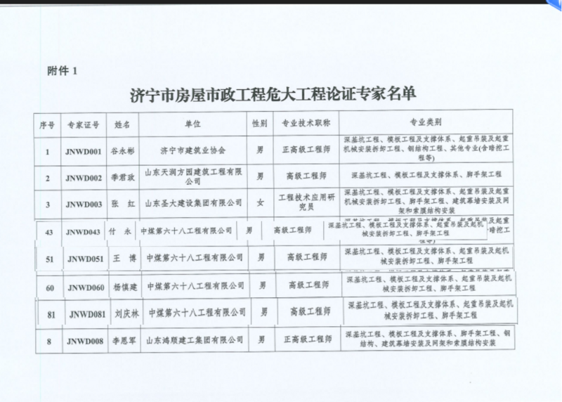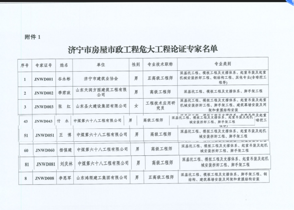 近日,济宁市住房和城乡建设局传来消息,我公司刘庆林、付永、杨慎建、王博4名职工凭借深厚的专业积淀、丰富的实践经验及良好的行业口碑,成功入选《济宁市房屋市政工程危大工程论证专家及质量安全检查专家名单》。